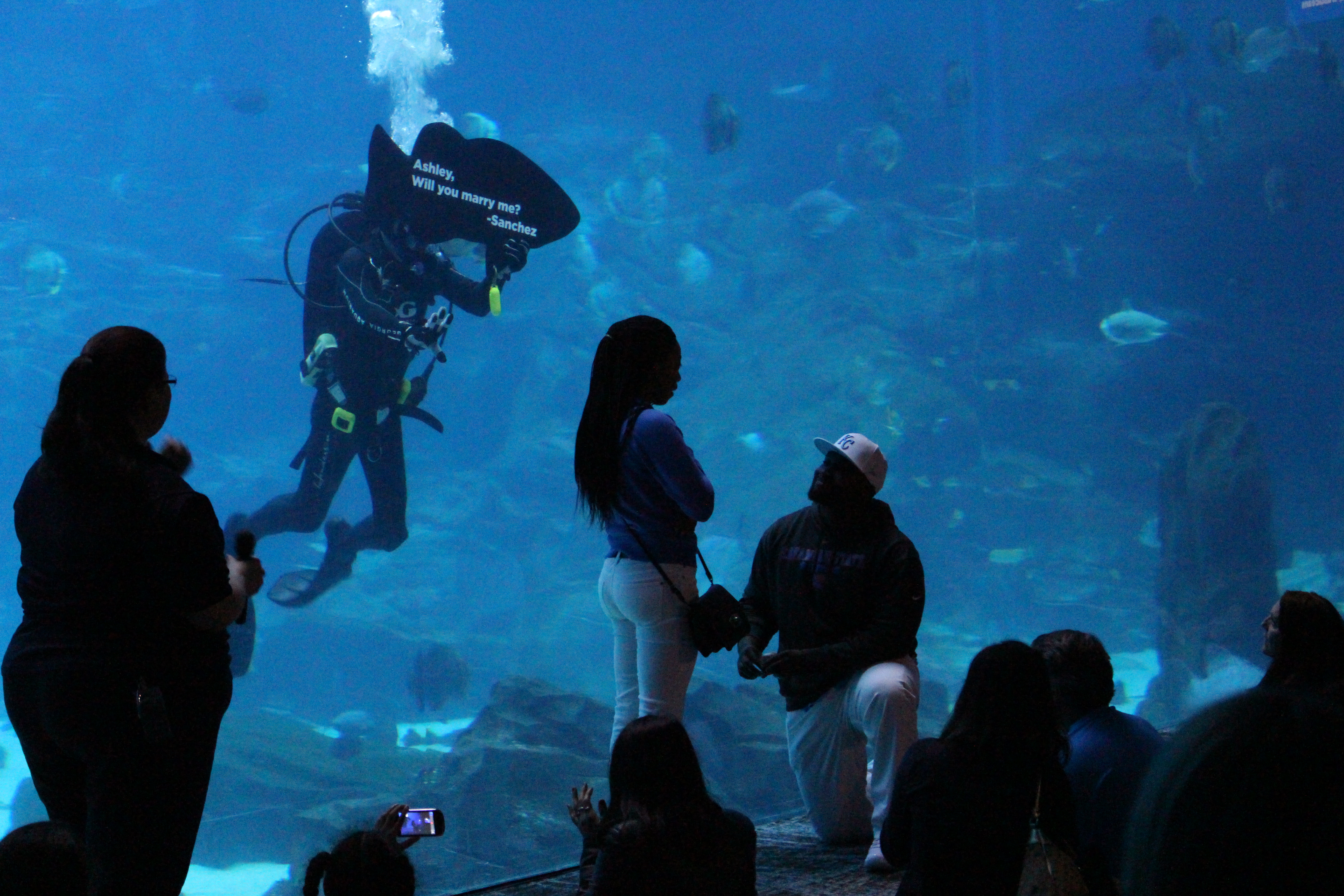 While we were at the aquarium we happened to witness a pretty creative and original wedding proposal, these two were called up to the front as volunteers and had to answer questions asked by the scuba diver. Here’s the question.
